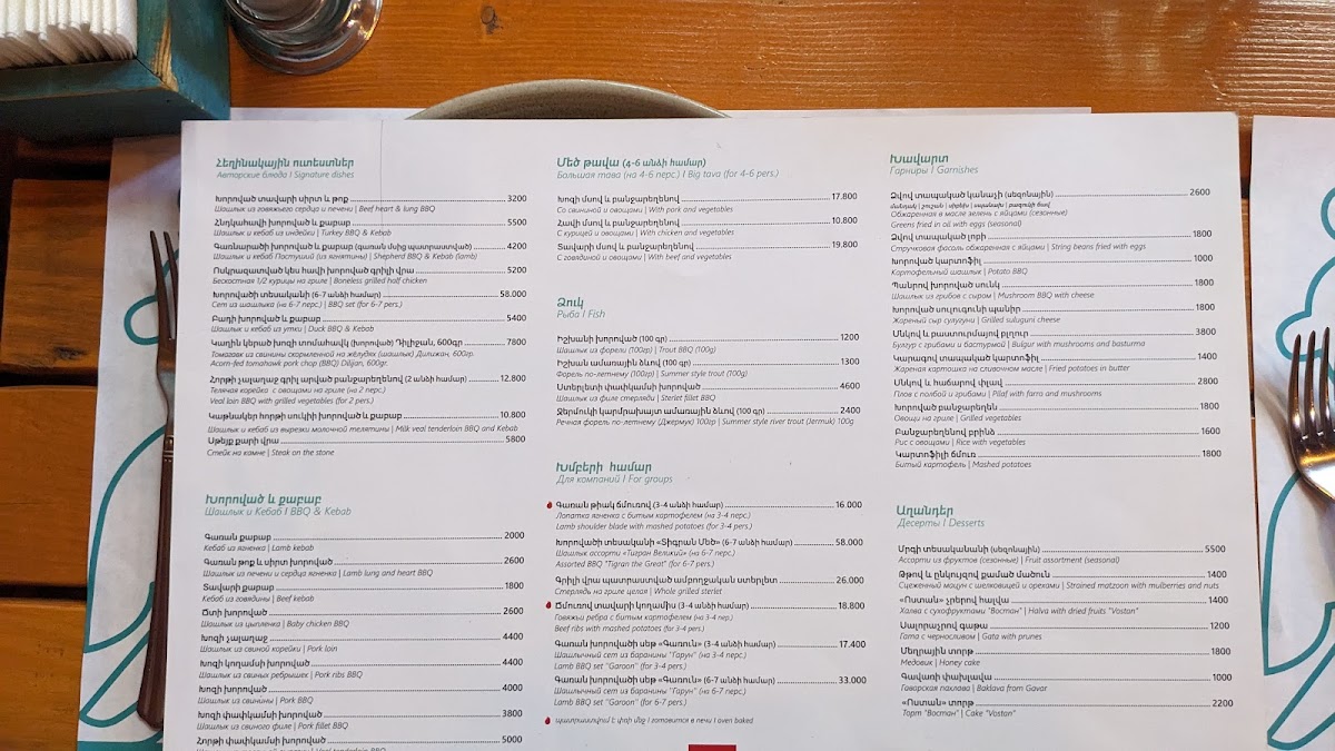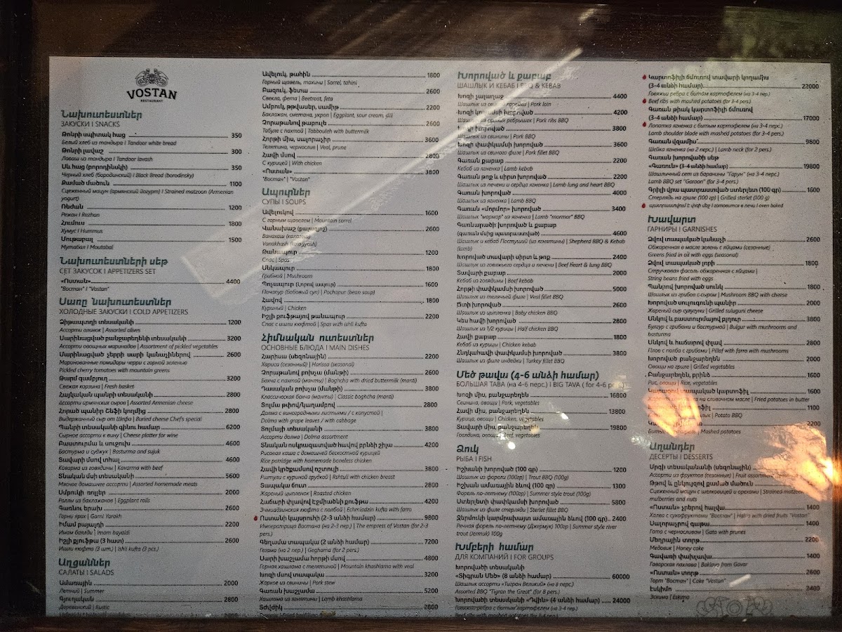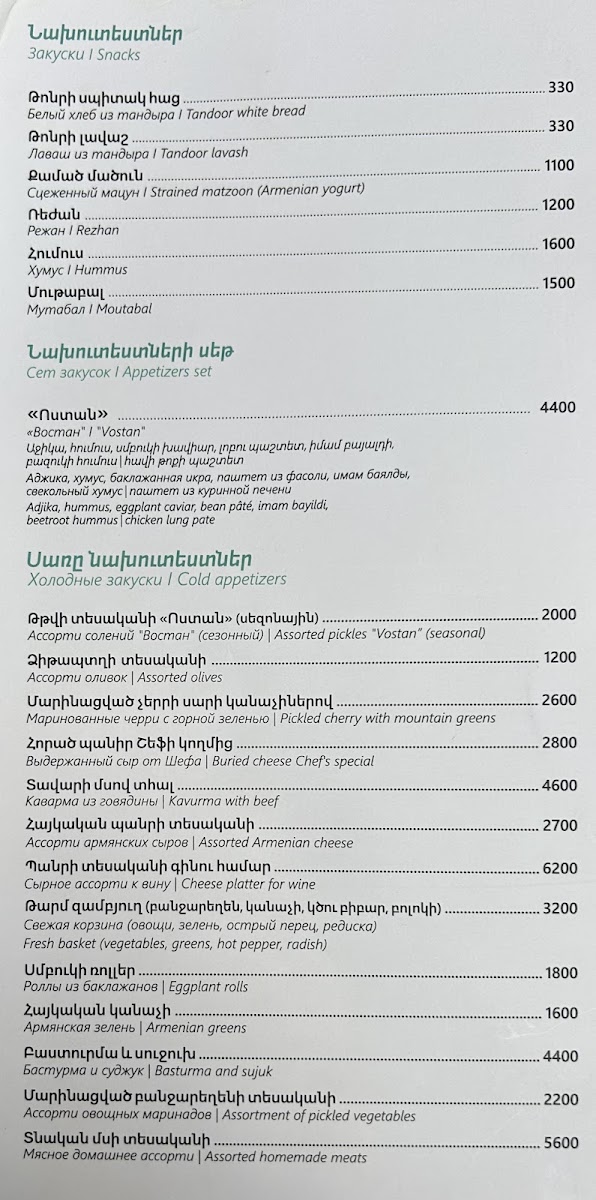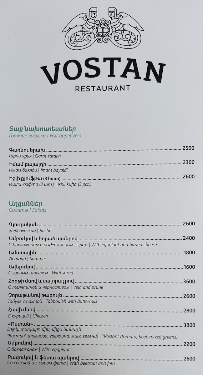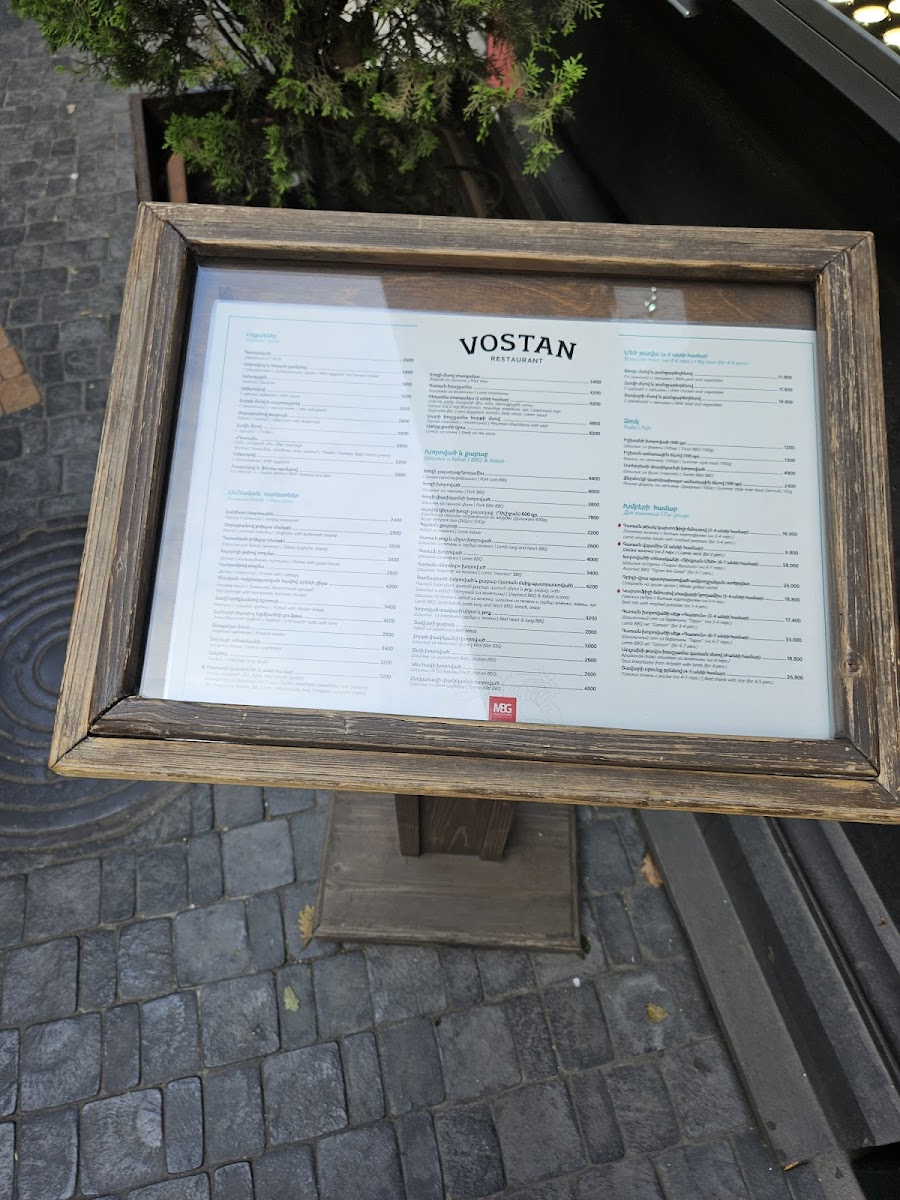 Welcome to Vostan, a gem nestled in the heart of Yerevan. Located at 8 Abovyan St, Vostan invites diners into a beautifully designed space that boasts a welcoming atmosphere complemented by an inner courtyard adorned with trees and green spaces. The menu features a delightful array of local cuisine, with highlights including the exquisite lamb kebab and exceptional dolma, each plate a visual treat as well as a culinary delight.